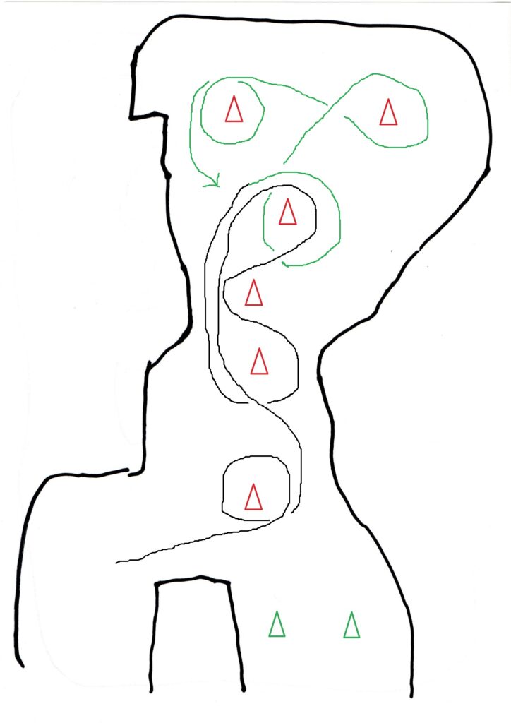 広場に入ったら、大きく回って中央のパイロンを回転して、さらに奥を大きく回って中央のパイロンを回転してゴールします。覚えやすくてカンタンだと思います。