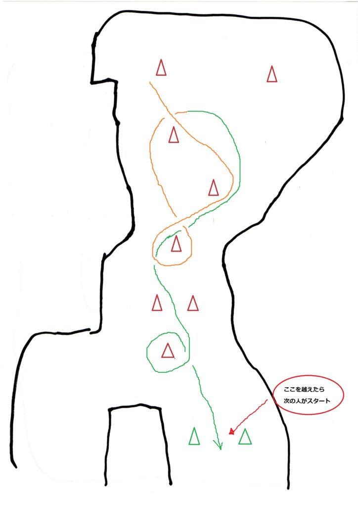 いってこいセクションをVの字にして、それぞれをいってこいセクションを行うという、至ってシンプルなコース。右と左のパイロン数が異なり、パイロン間の距離が少し変わるので、速度域も変わってくる…ちょっと面白そうなコースとなります。